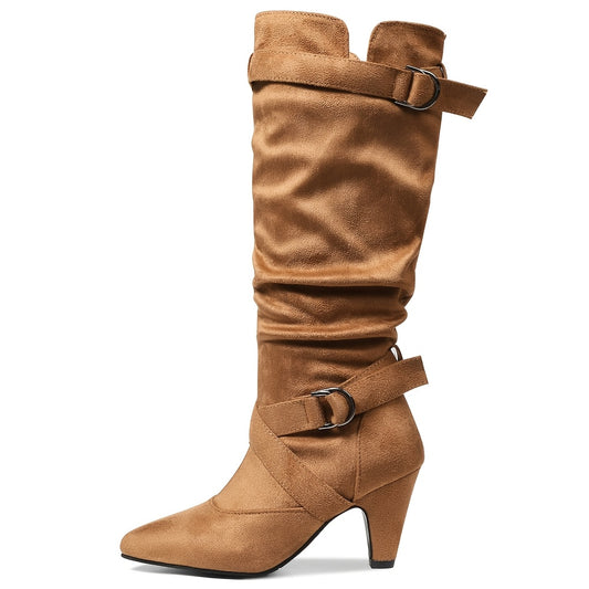Women's Brown Retro Mid-Calf Boots - Thick High Heels, Pointed Toe, Buckle Straps, Stylish Pull-On for Party or Office, Suedelike