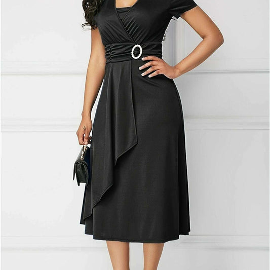 Plus Size Elegant V-Neck Belted Midi Dress with Flowy Hem