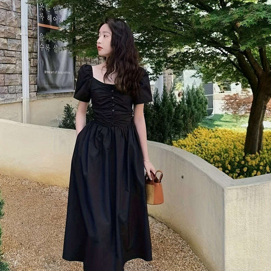 Korean-French Vintage Square Neck A-Line Dress for Women