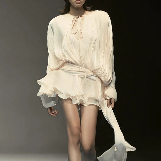 VGH Minimalist Solid Loose Short Dresses For Women Round Neck Long Sleeve High Waist Spliced Lace Up Chic Dress Female Fashion