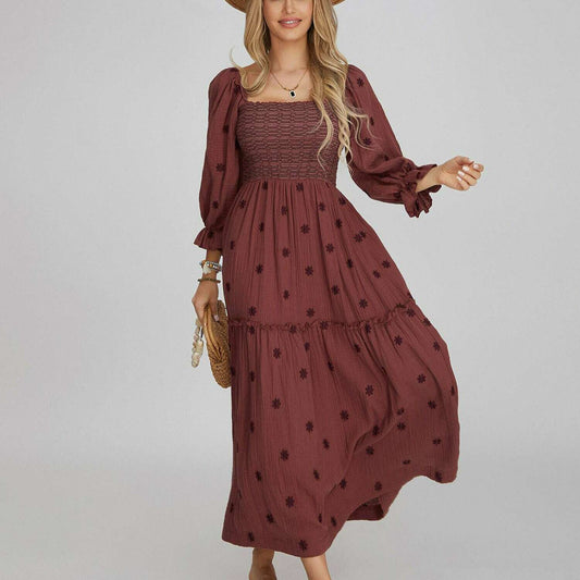 Women Summer Casual Long Dress 3D Embroidered Flowers Square Neck Puff Sleeve Dress Fashion Backless A-line Dress