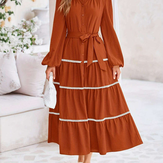 Women'S Spring Casual Dress Loose Drawstring Lantern Sleeve Long Sleeve Tier Dress With Pockets