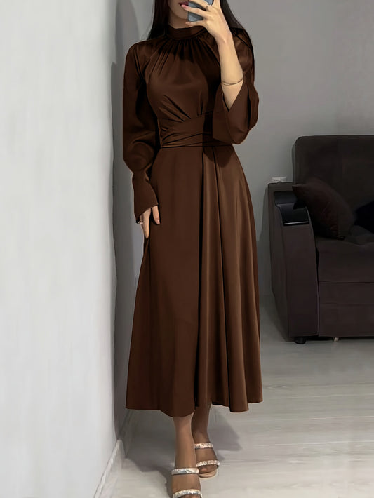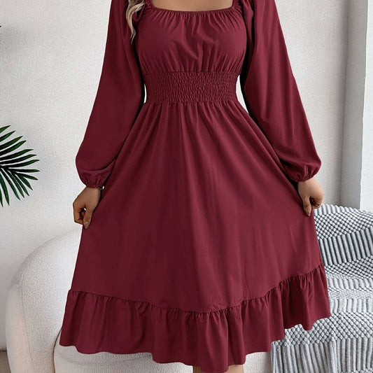 Ruffle Hem Lantern Sleeve A-line Dress, Elegant Solid Color Square Neck Backless Shirred Dress, Women's Clothing
