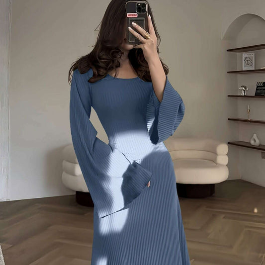 Solid Color Women'S Ribbed Knit Dress with Long Bell Sleeves, Round Neck, And Back Tie.