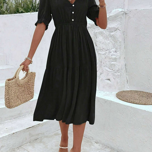 Women's Solid V-Neck Button Front Ruffle Hem Dress