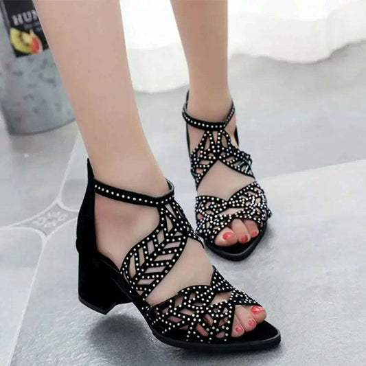 2024 Summer Black Lace Rhinestone Sandals - Low Heel & Floral