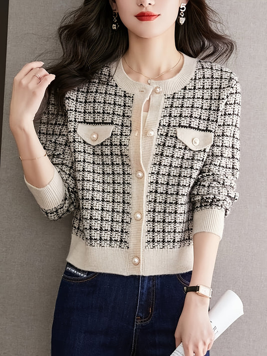 [Classic Plaid Cardigan] Classic Knitwear Women's Short Plaid Cardigan | Loose Fit Long Sleeve Open Front Sweater in Black/White/Beige/Brown | Machine Washable Round Neck Casual Chic Top for Spring & Fall | Autumn Apparel, Co