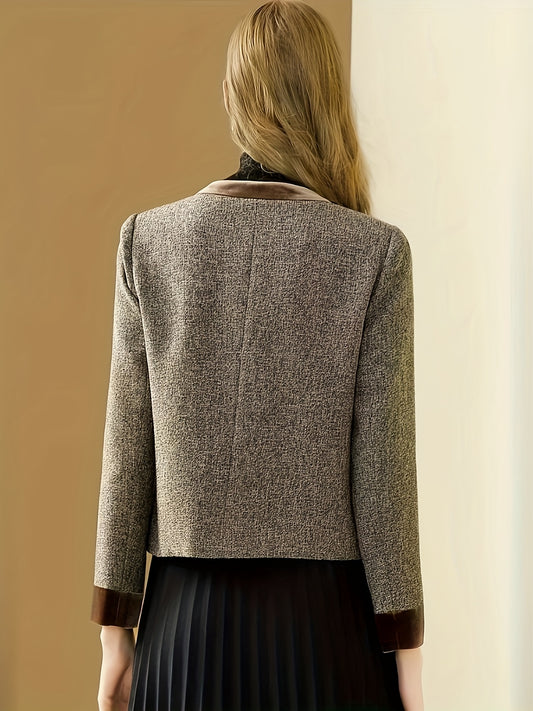 Women's Contrast Color Block Round Neck Short Jacket - Elegant Loose Fit Long Sleeve Spring/Fall Coat, Machine Washable Single-Breasted Casual Chic Outerwear, Spring Fashion, Sophisticated Style, Textured Fabric, Seasonal Tra