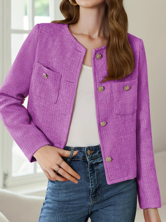 [Office Ready] Women's Elegant Purple Tweed Jacket - Long Sleeve Button Cropped Blazer with Pockets, Soft Polyester Fabric, Perfect for Fall/Winter Business Casual Style, Business Casual Wear | Buttonup Jacket | Textured Twee