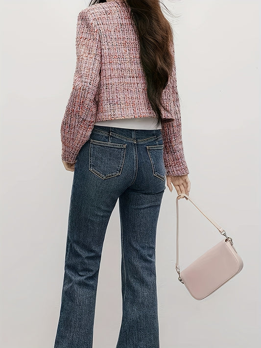 2005 [Elegant Tweed Blazer] Lightweight Polyester Elegant Women's Chic Tweed Blazer - Long Sleeve, Button Front, Non-Sheer, Solid Color Jacket for Work & Casual