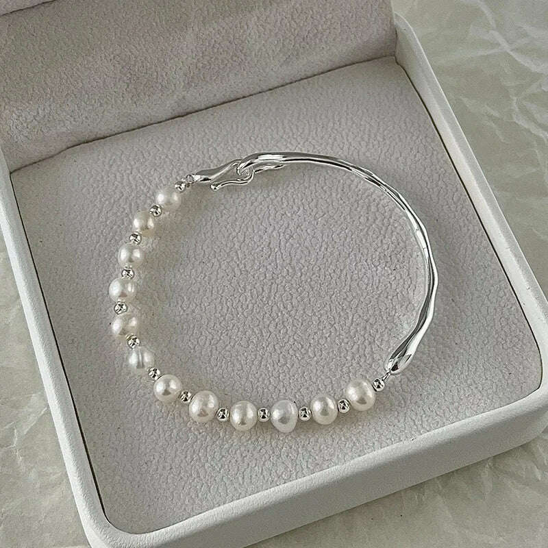 Indulge in luxury with our vintage 925 sterling silver pearl bracelet. This stunning piece features irregular metal knots and charming pearls, making it the perfect accessory for any fashion-forward woman. The intricate design and high-quality materials make this bracelet a must-have for any special occasion or everyday wear.