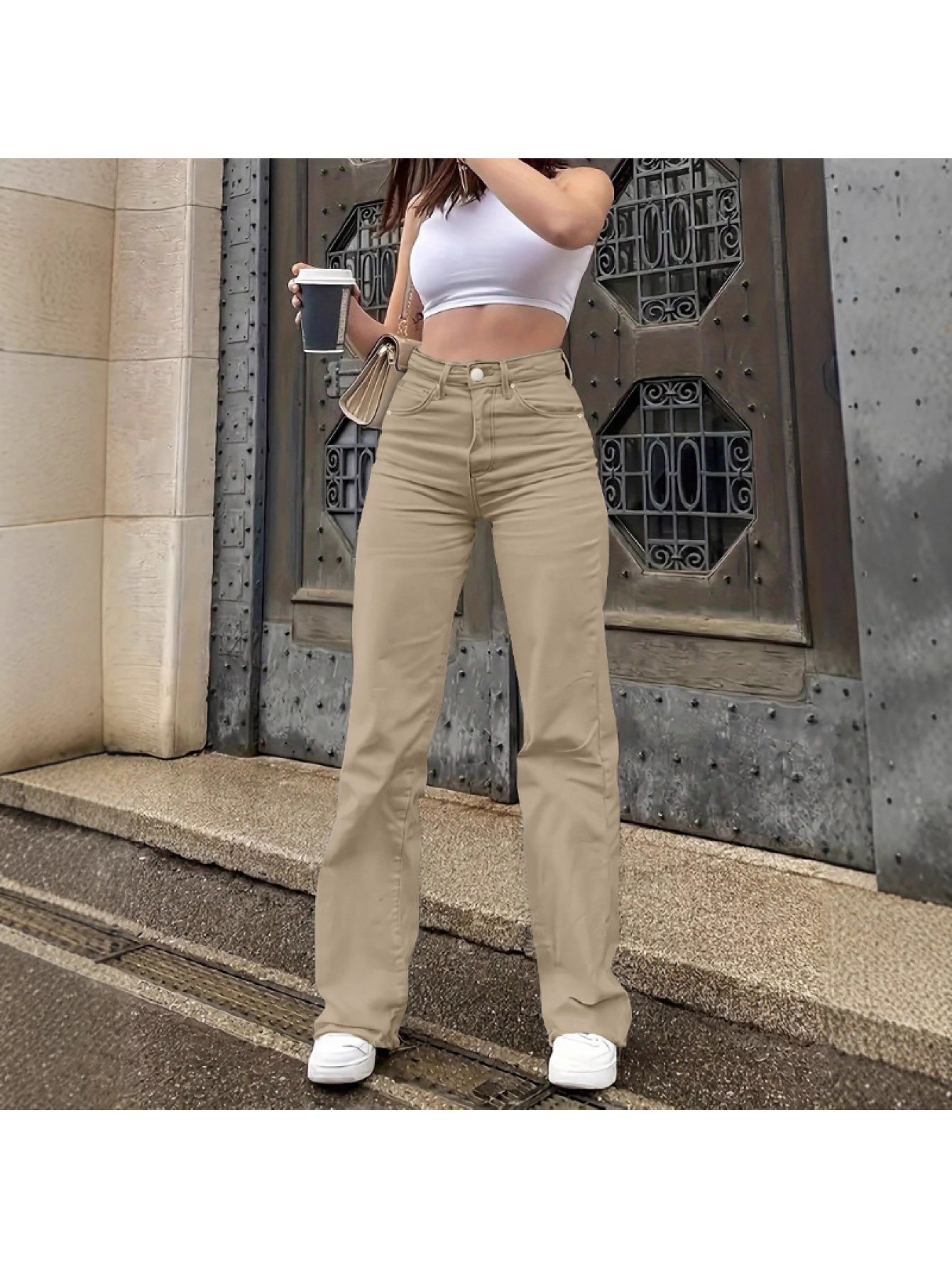 Women'S High-Waisted Straight-Leg Jeans - Stretch Denim with Pockets, Beige, Casual & Workplace Style, Mid-Rise, Flared Design, Perfect for Spring Commuting, High Waisted Jeans